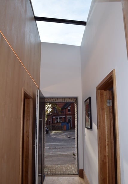 Stunning new high-glazed entrance hall with our lighting line effect.