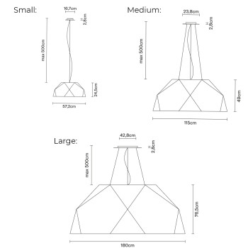 | Dimensions: | Small: Shade: 57.2cm Shade Height: 24.5cm Ceiling Canopy: 16.7cm x 2.8cm Medium: Shade: 115cm Shade Height: 49cm Ceiling Canopy: 23.8cm x 2.8cm Large: Shade: 180cm Shade Height: 76.5cm Ceiling Canopy: 42.8cm x 2.8cm Maximum Drop Height: 500cm |