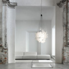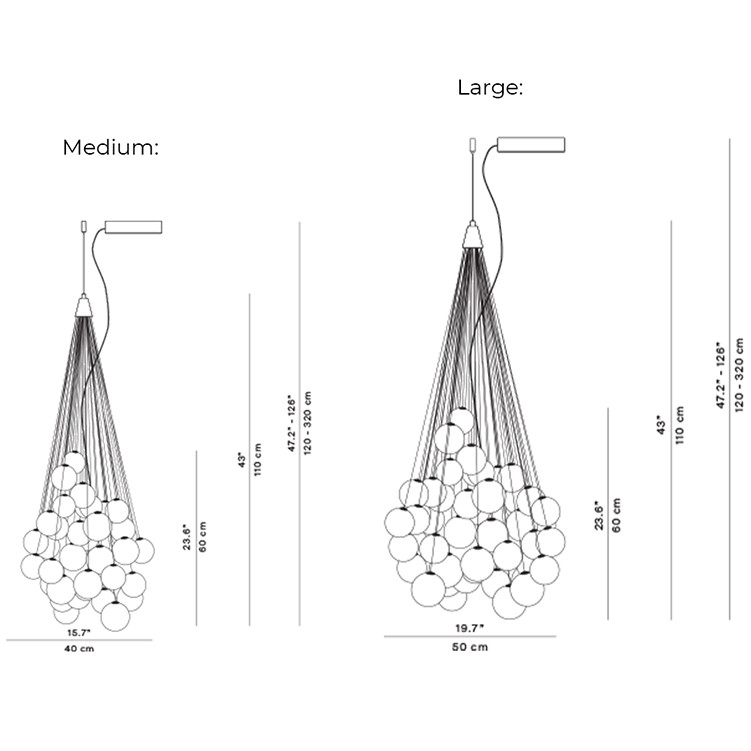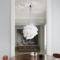 Cluster feature light formed of blown glass spheres displayed at varying heights. Each sphere is connected to a steel rod, giving a creative style when gathered at the ceiling rose. Choose between semi-transparent white or metallised mirror finished spheres.