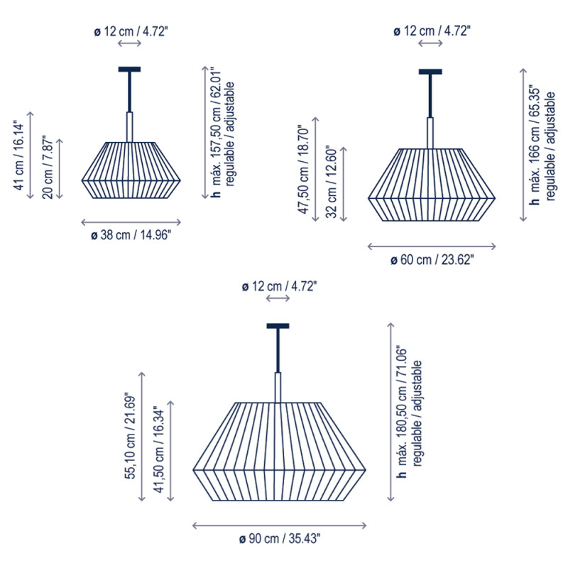 | Dimensions: | Mae 38: Shade: Ø38cm Shade Height: 20cm Maximum Drop Height: 157.5cm Mae 60: Shade: Ø60cm Shade Height: 32cm Maximum Drop Height: 166cm Mae 90: Shade: Ø90cm Shade Height: 41.5cm Maximum Drop Height: 180.5cm Ceiling Canopy: Ø12cm |